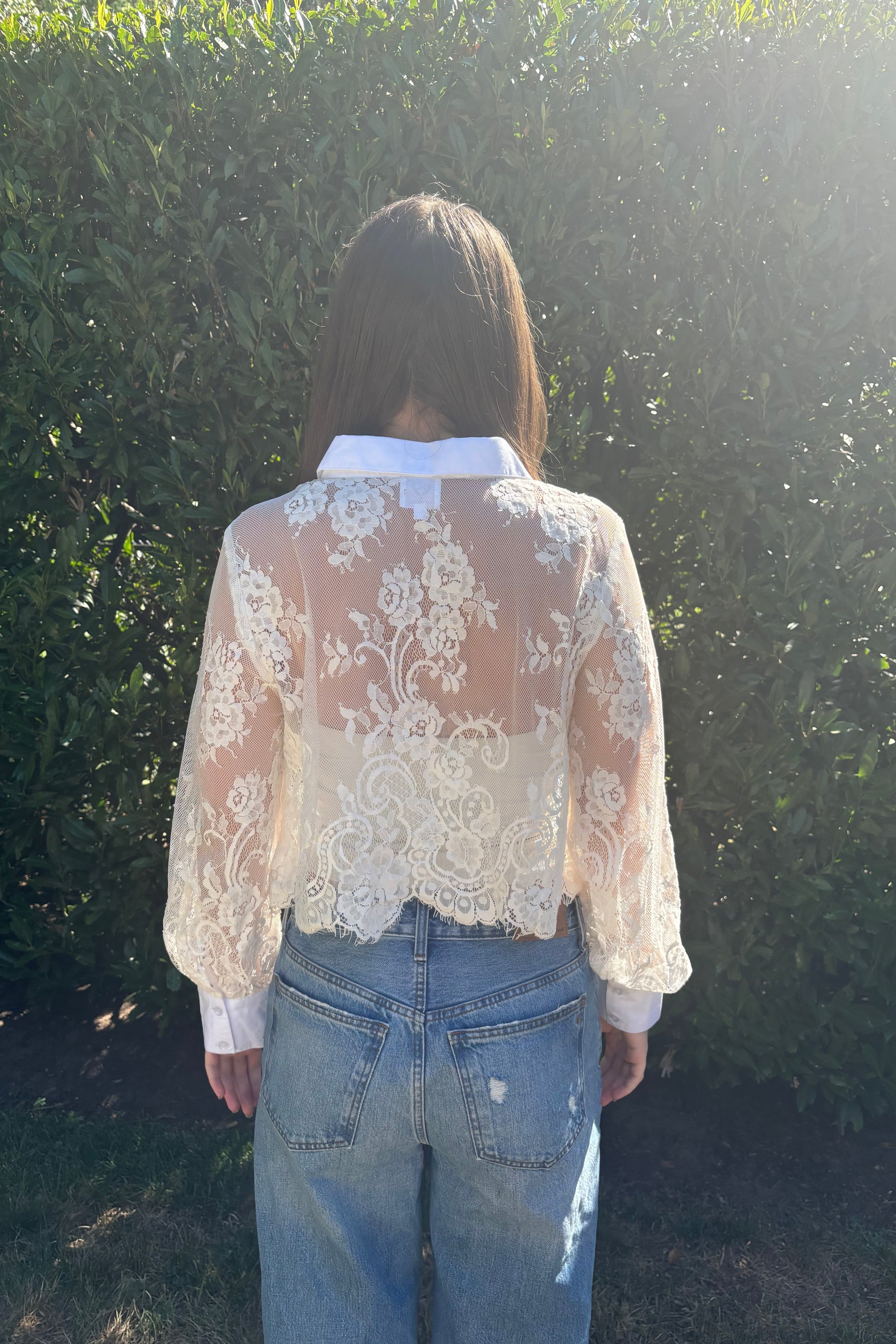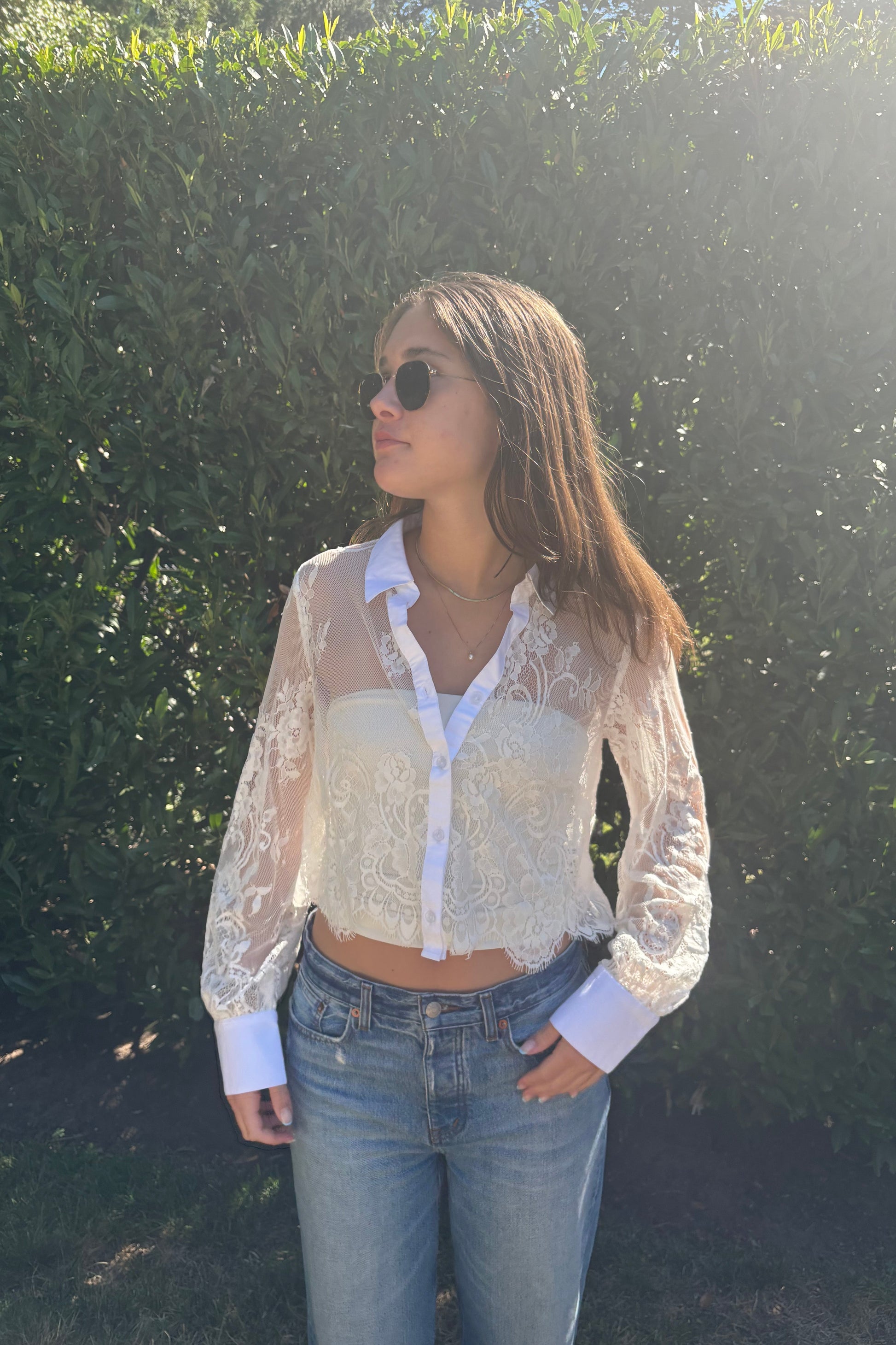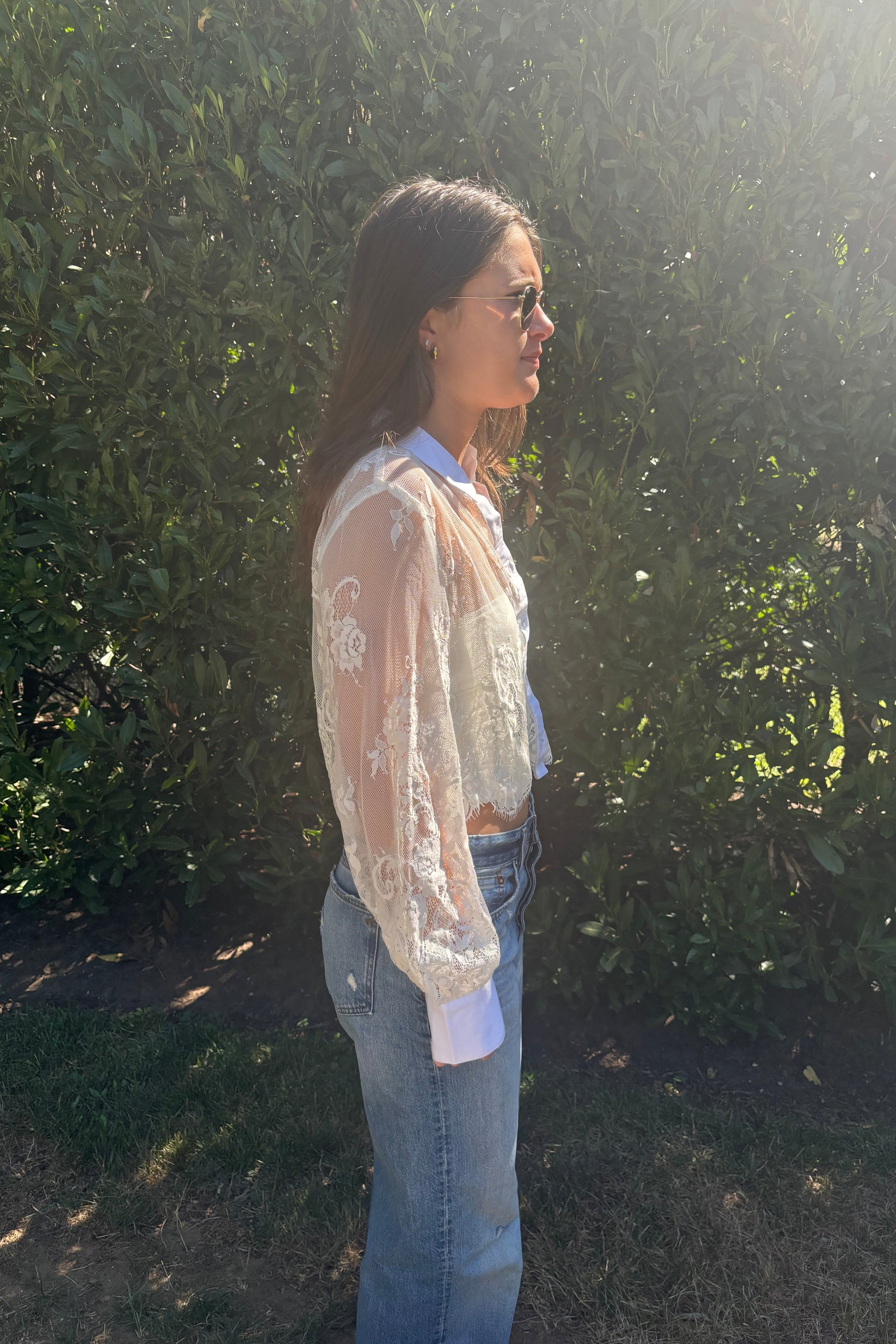Introducing our cropped white lace button-up shirt with a sheer, airy finish. Elegant yet casual, perfect for layering or warm-weather styling.
