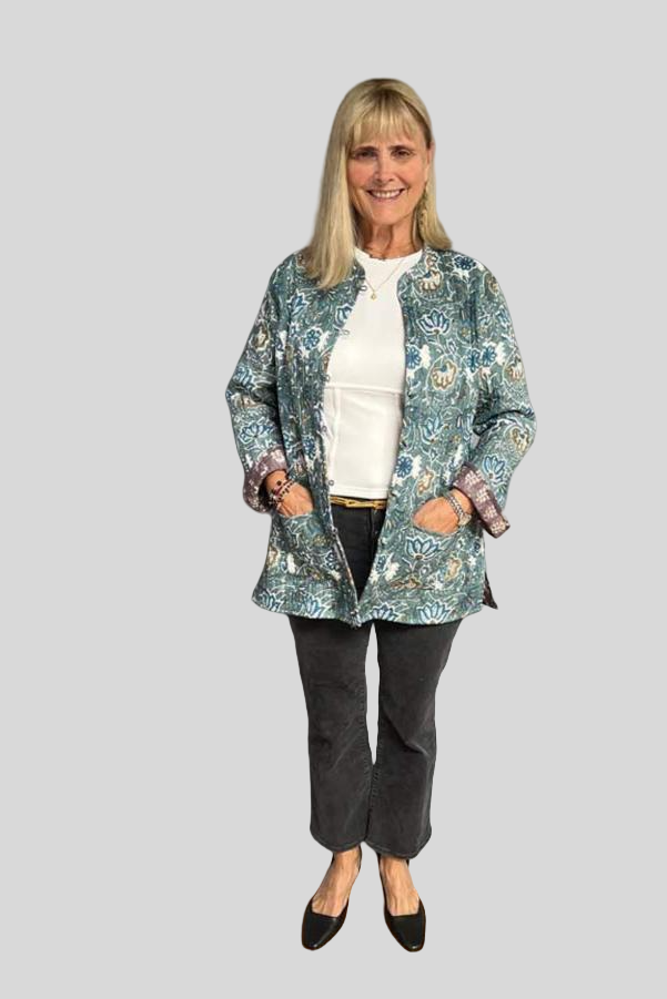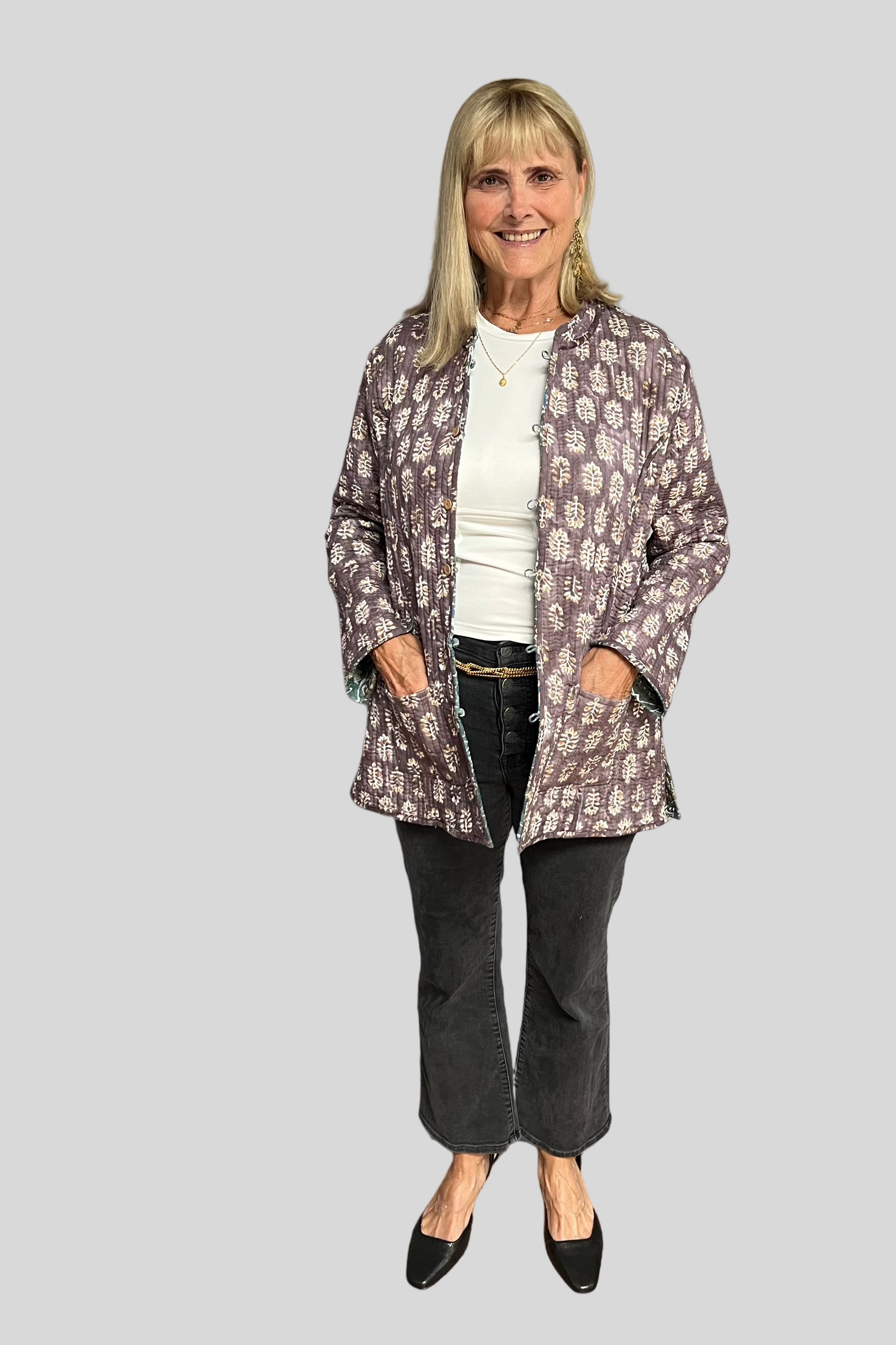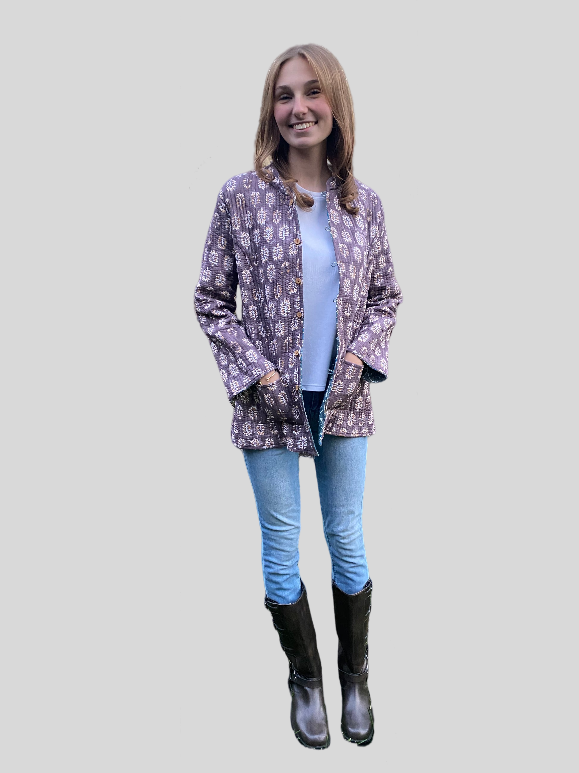 This 100% cotton block print quilted reversible jackets offer versatile style and warmth, featuring pockets and a different pattern on each side, giving you two jackets in one—perfect for travel!