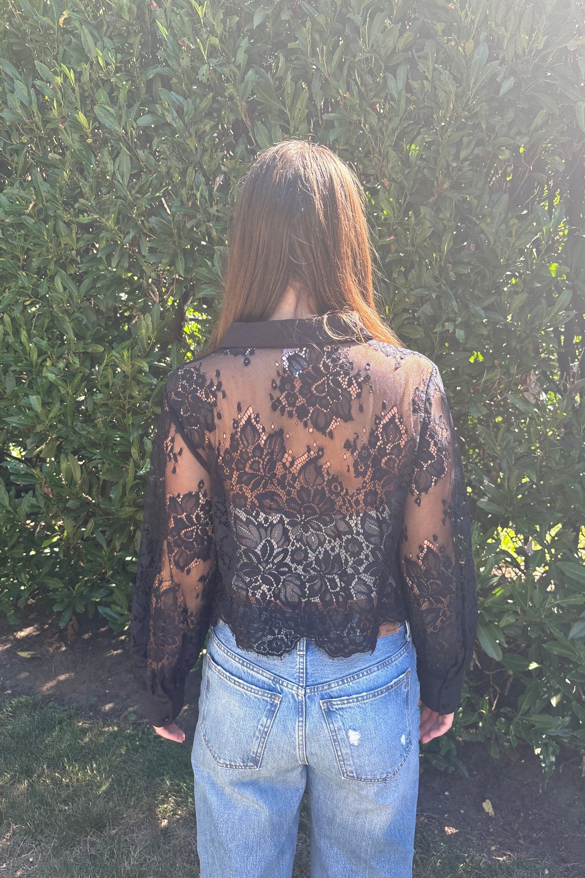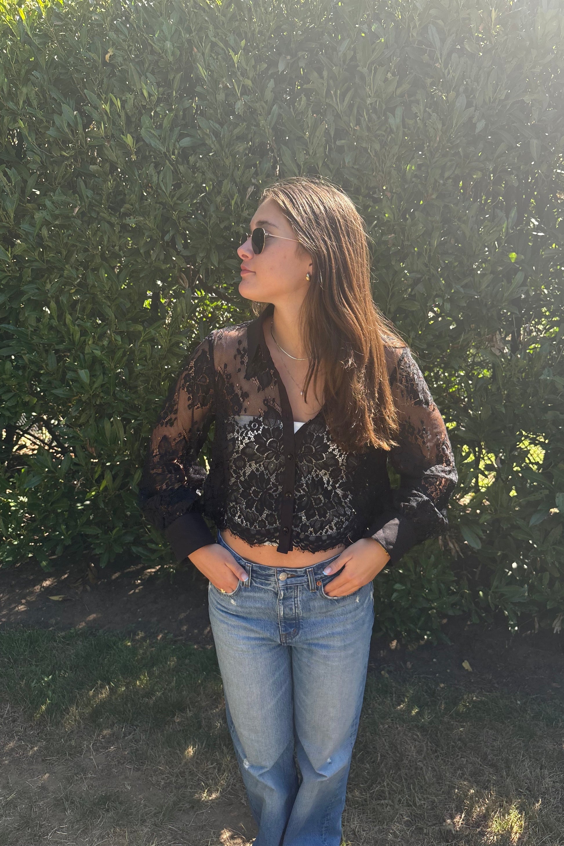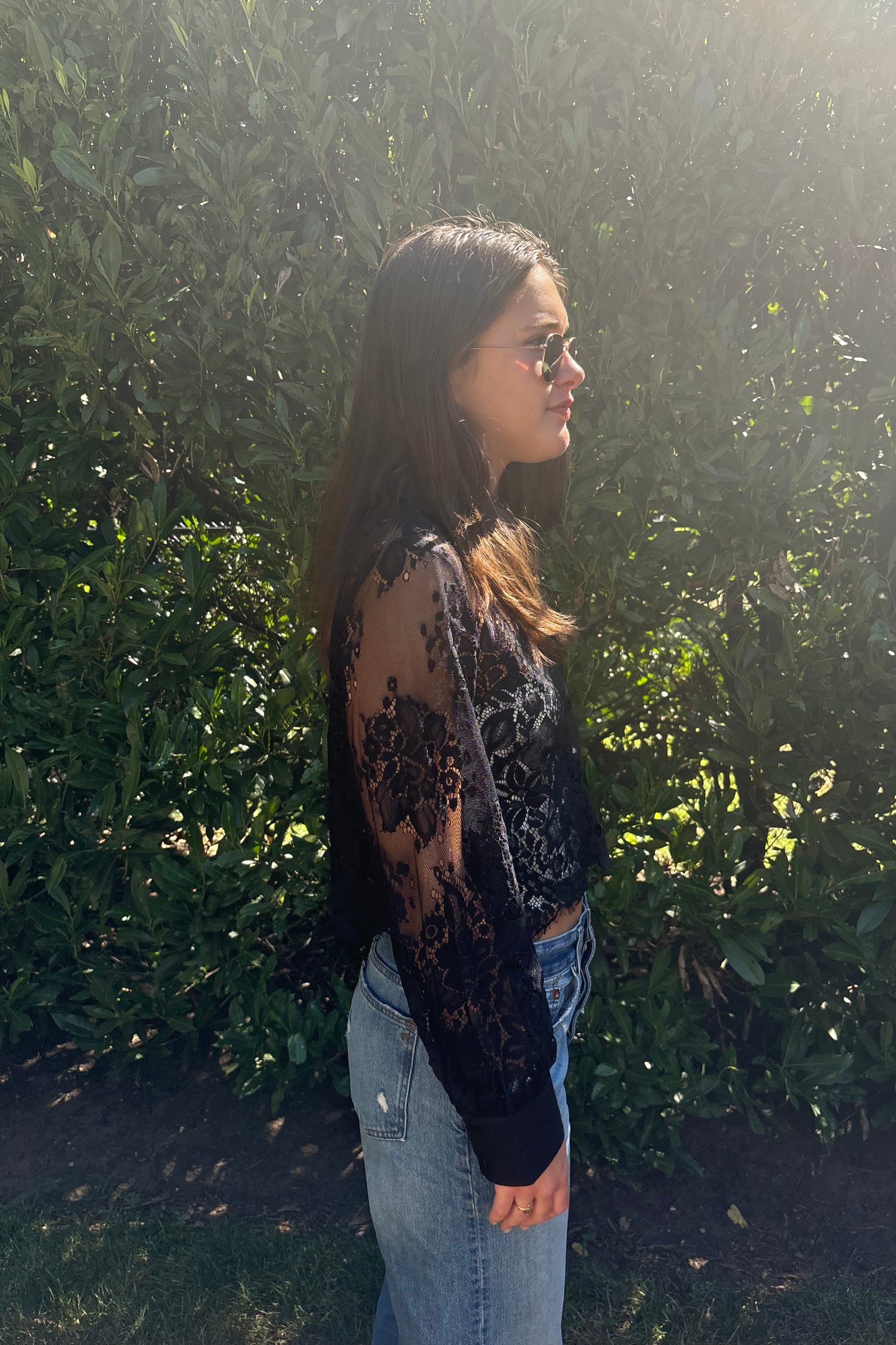 Sheer cropped black lace jacket that adds a touch of elegance to any outfit. Lightweight and breathable, it’s perfect for layering from breezy summer evenings into crisp fall days.