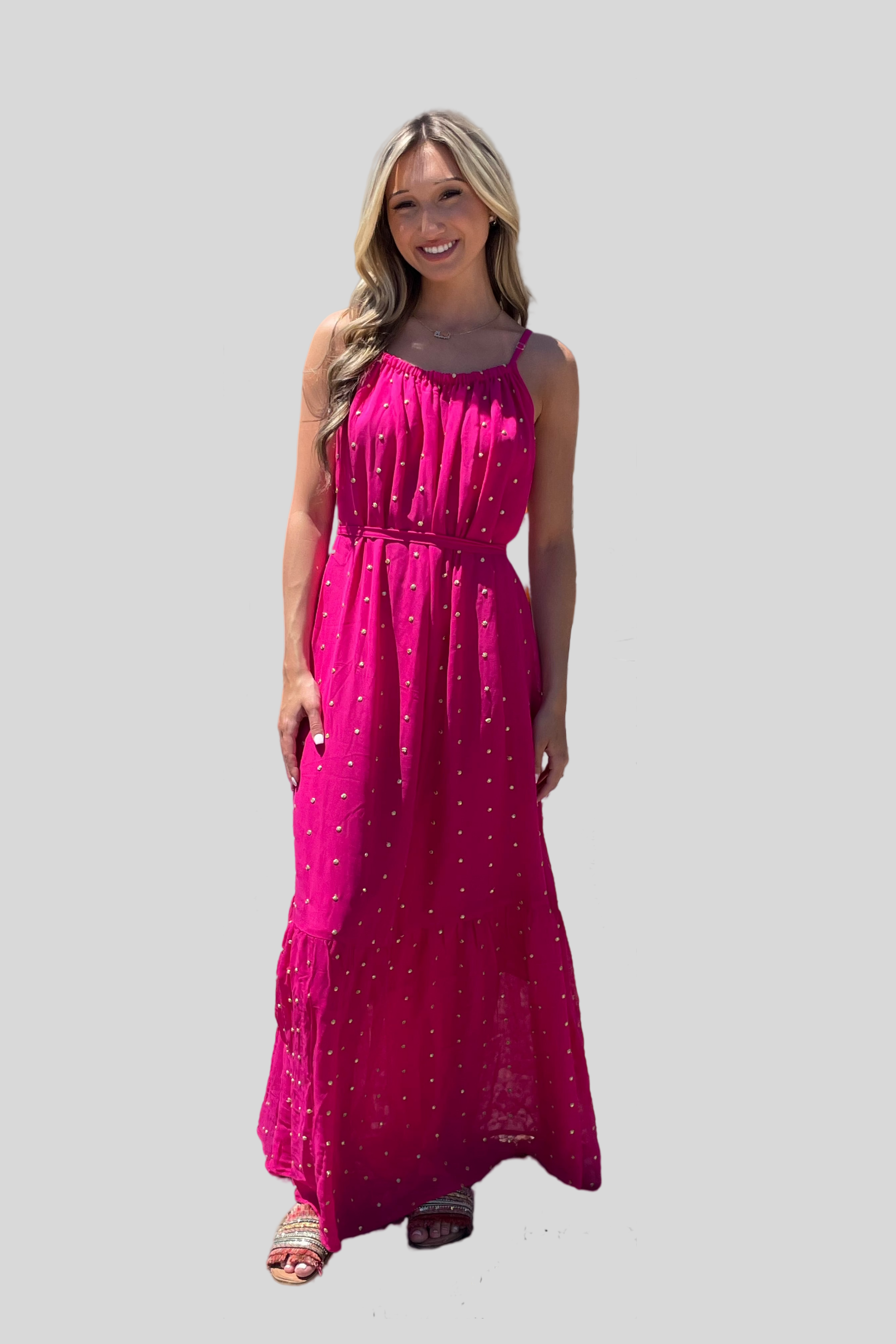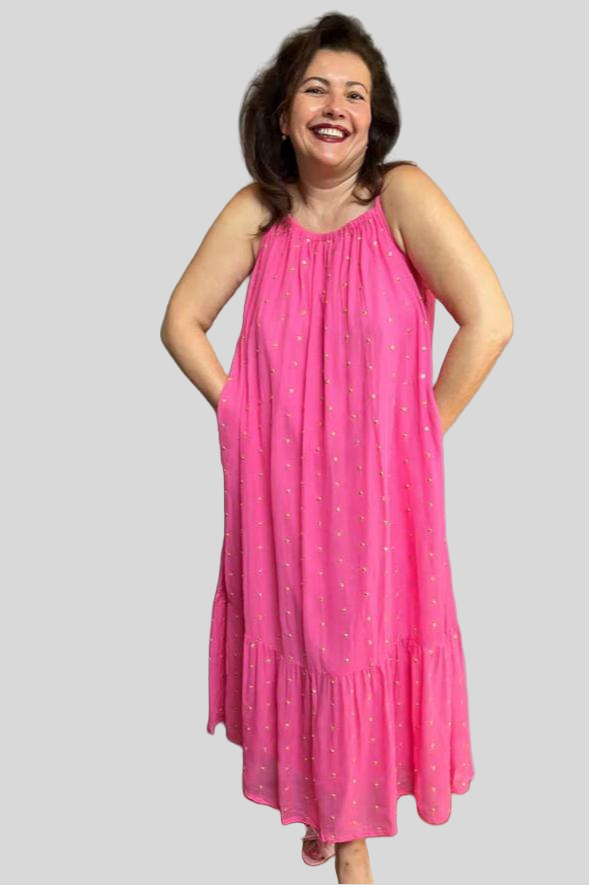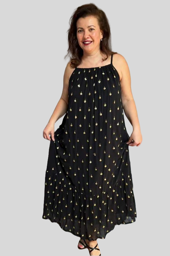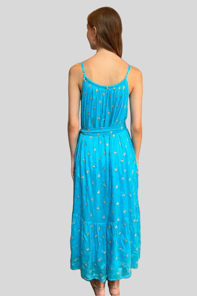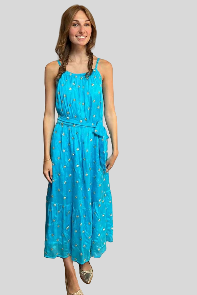This elegant gown is made from flowing georgette fabric, featuring intricate gold embroidered sequins that shimmer with every move. Designed as one-size-fits-all, it offers a graceful and flattering silhouette, perfect for any special occasion. Comes with an optional belt.