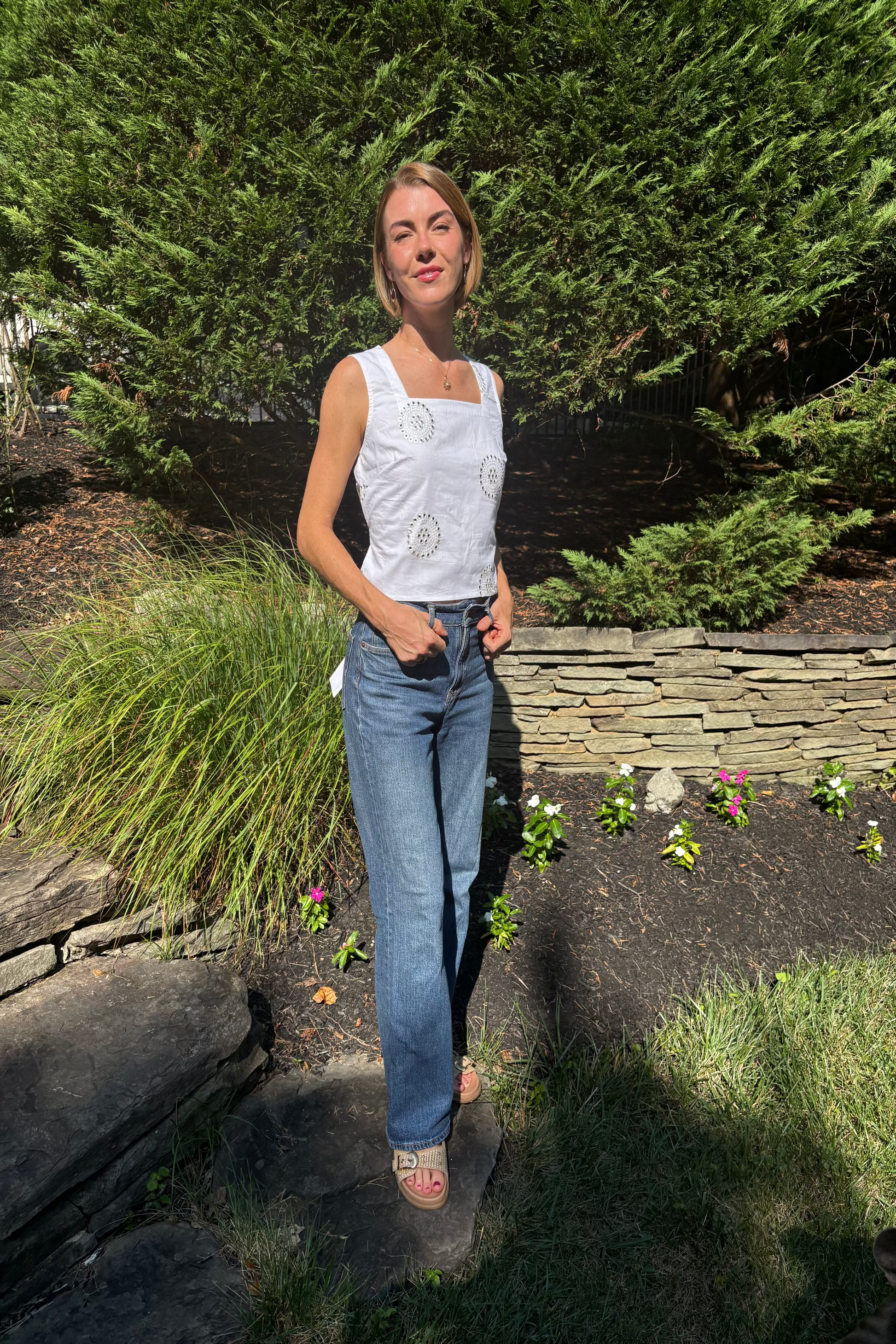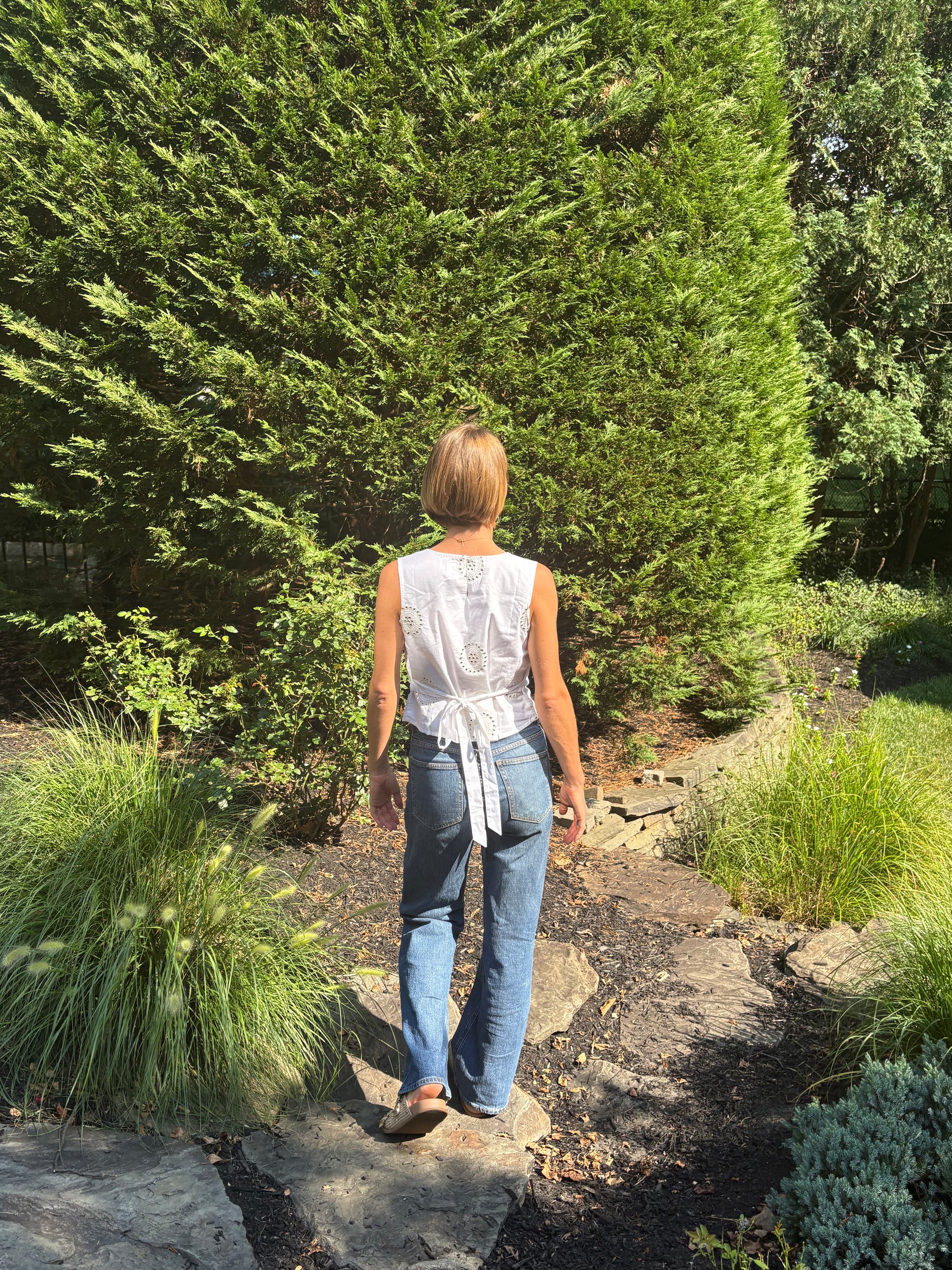 Elevate your everyday look with this 100% cotton tank top, featuring a stylish square neckline and delicate embroidered fabric. The adjustable tie-back design ensures a flattering, custom fit for effortless comfort and charm.