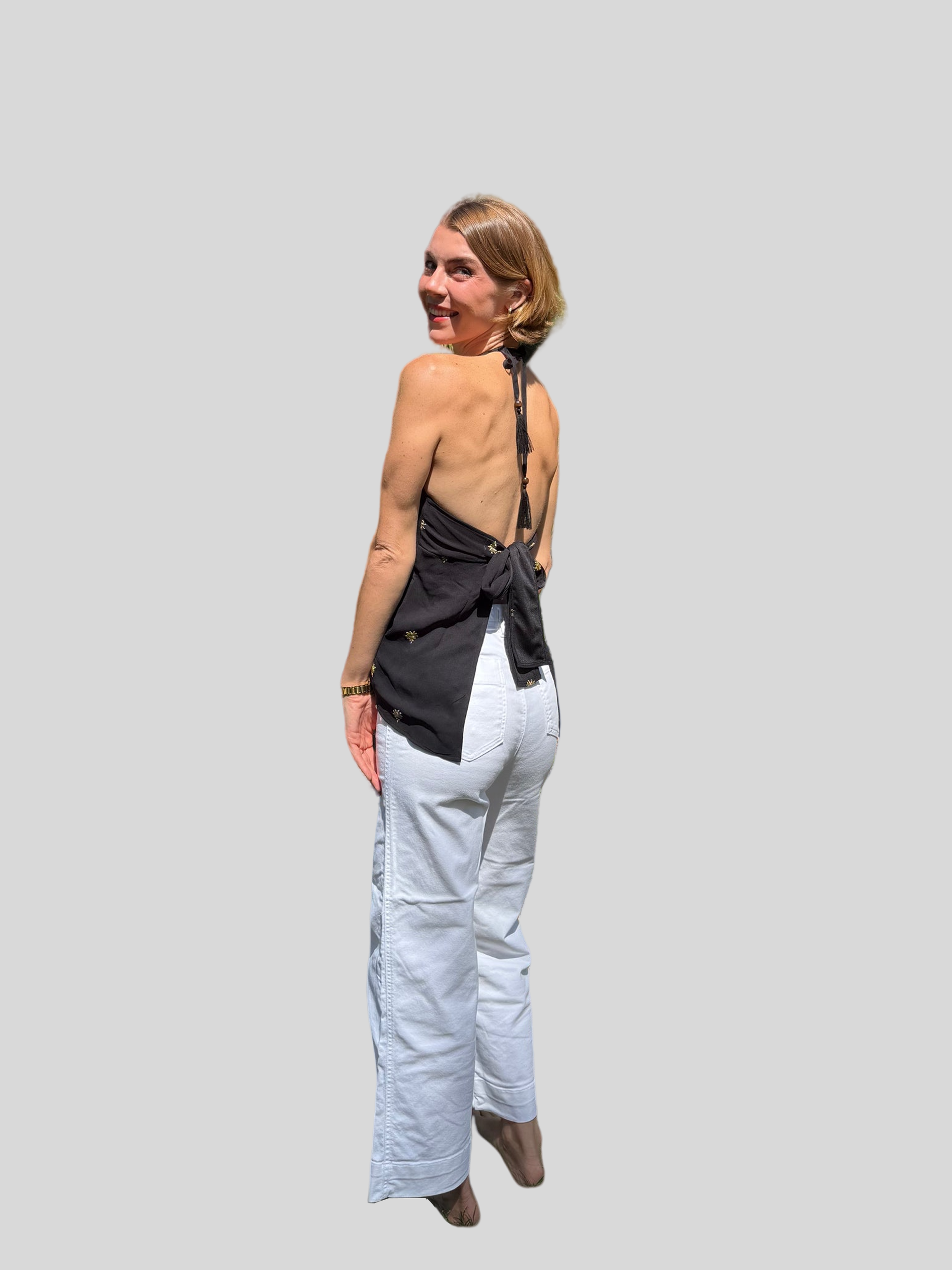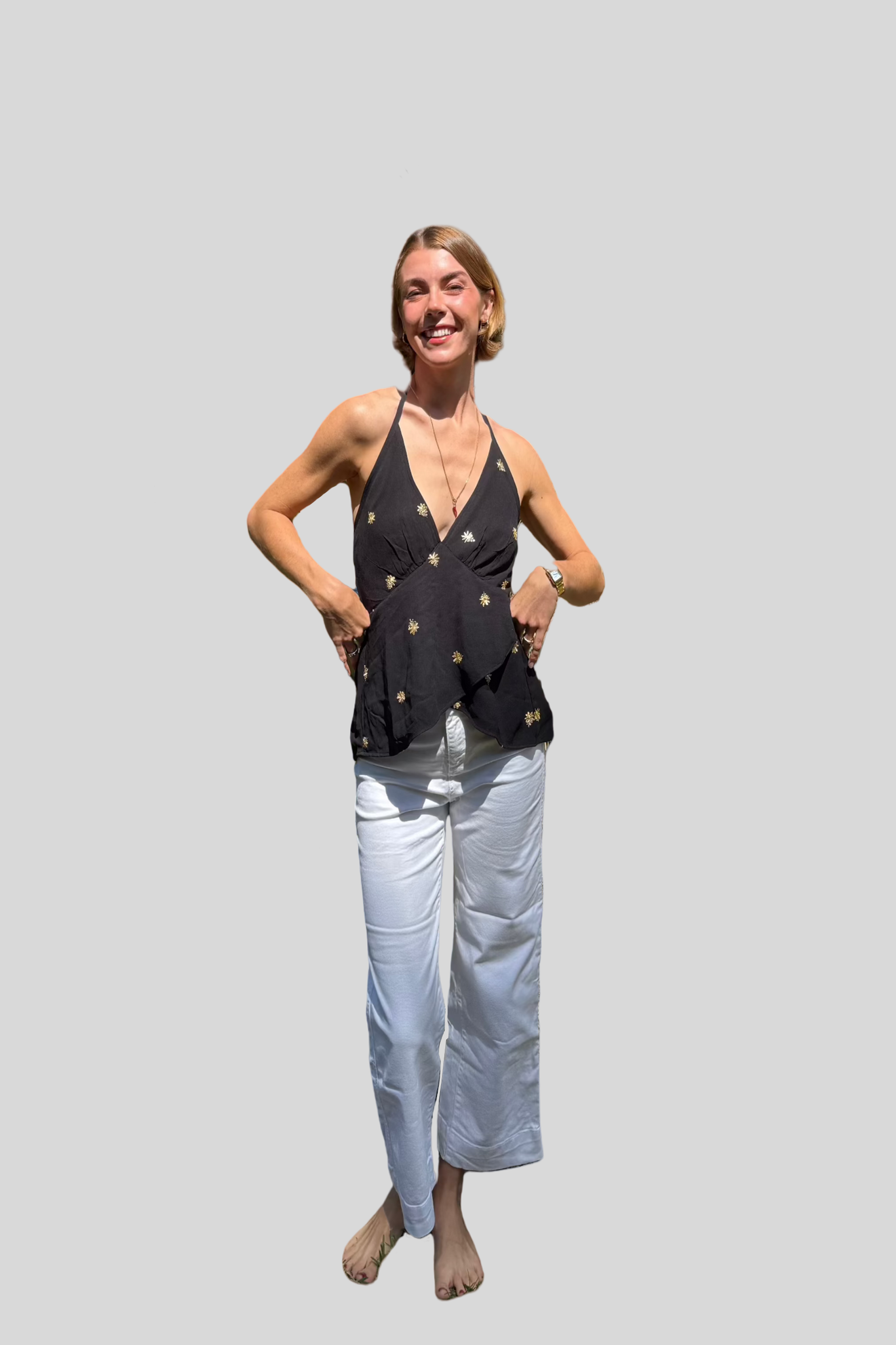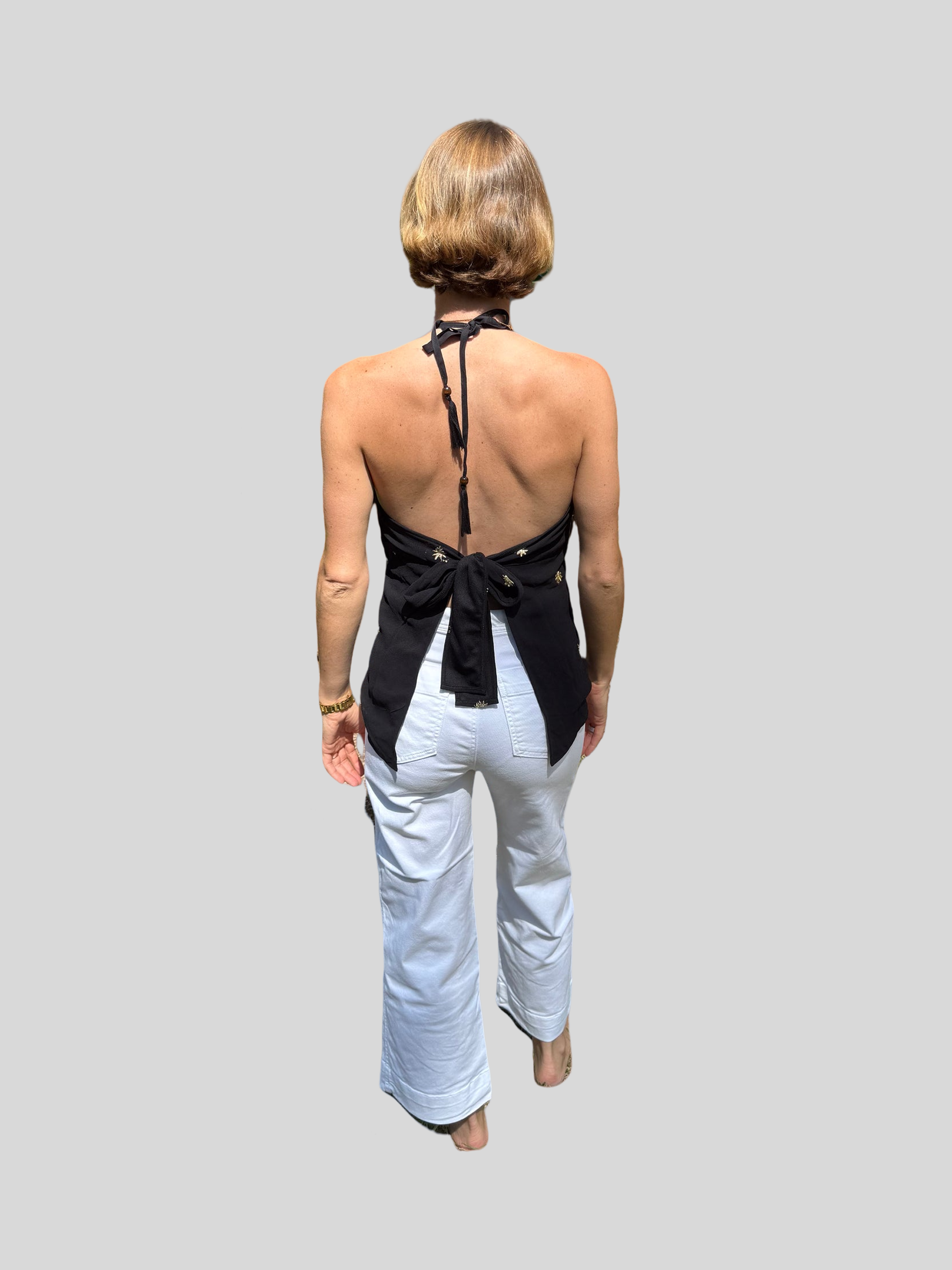 One size fits all black halter top adorned with stunning gold sequins and a stylish tie-back for a flattering, secure fit. Effortlessly pairs with pants or shorts for a look that's chic and versatile - dress it up or keep it casual