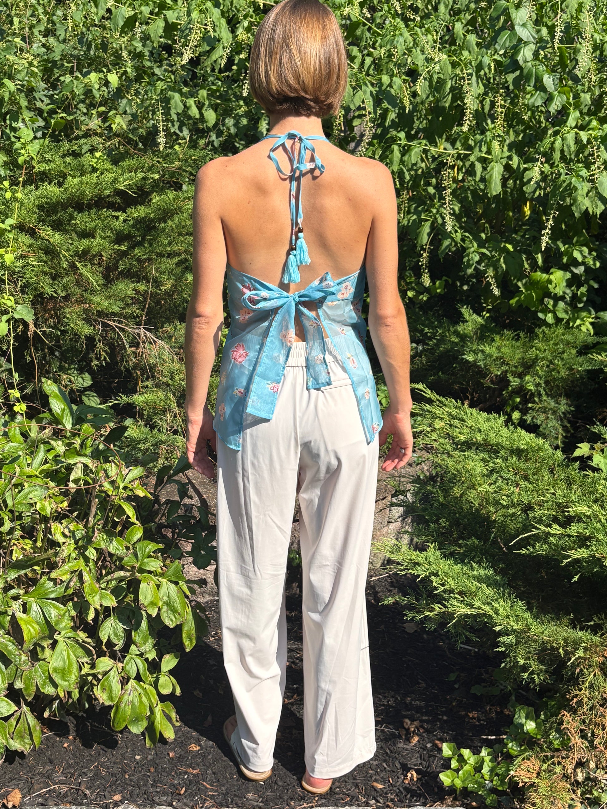 Easy, breezy one size fits all organza halter top made from lightweight fabric and with tieback detail for perfect custom fit. Pairs great with pants or shorts.