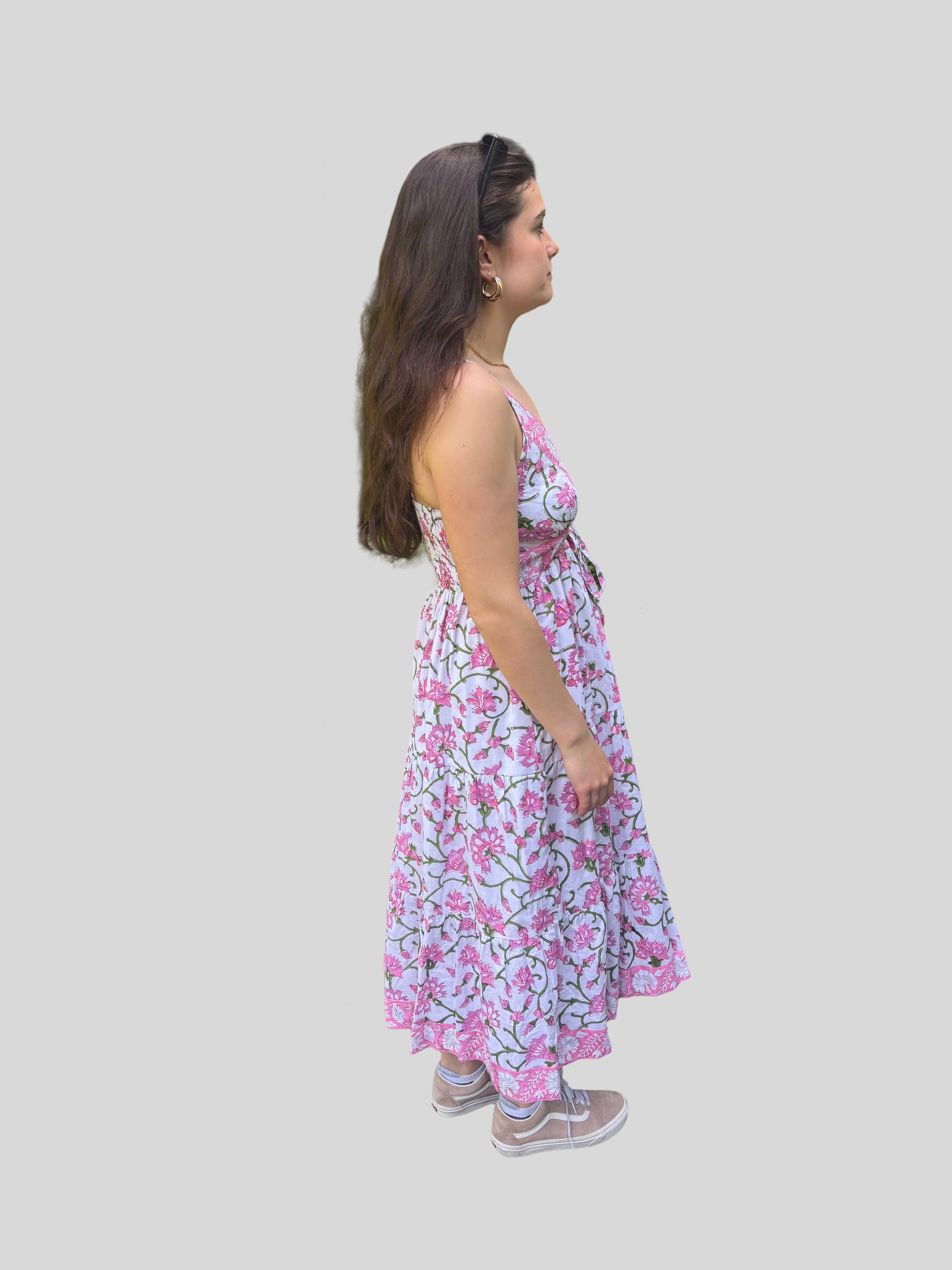 This block print Midi sundress, featuring a summery pink floral pattern is 100% cotton with lined pockets, adjustable straps, and a cinched waist for a flattering fit. The smocked back adds extra comfort and flexibility, making it a perfect one-size piece for effortless style.