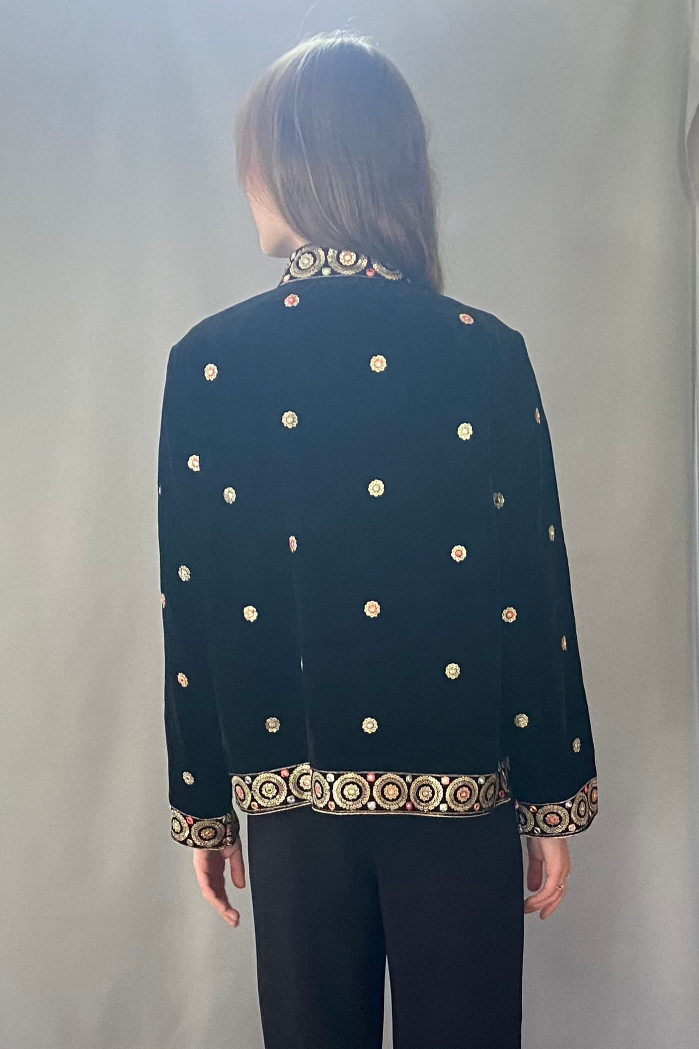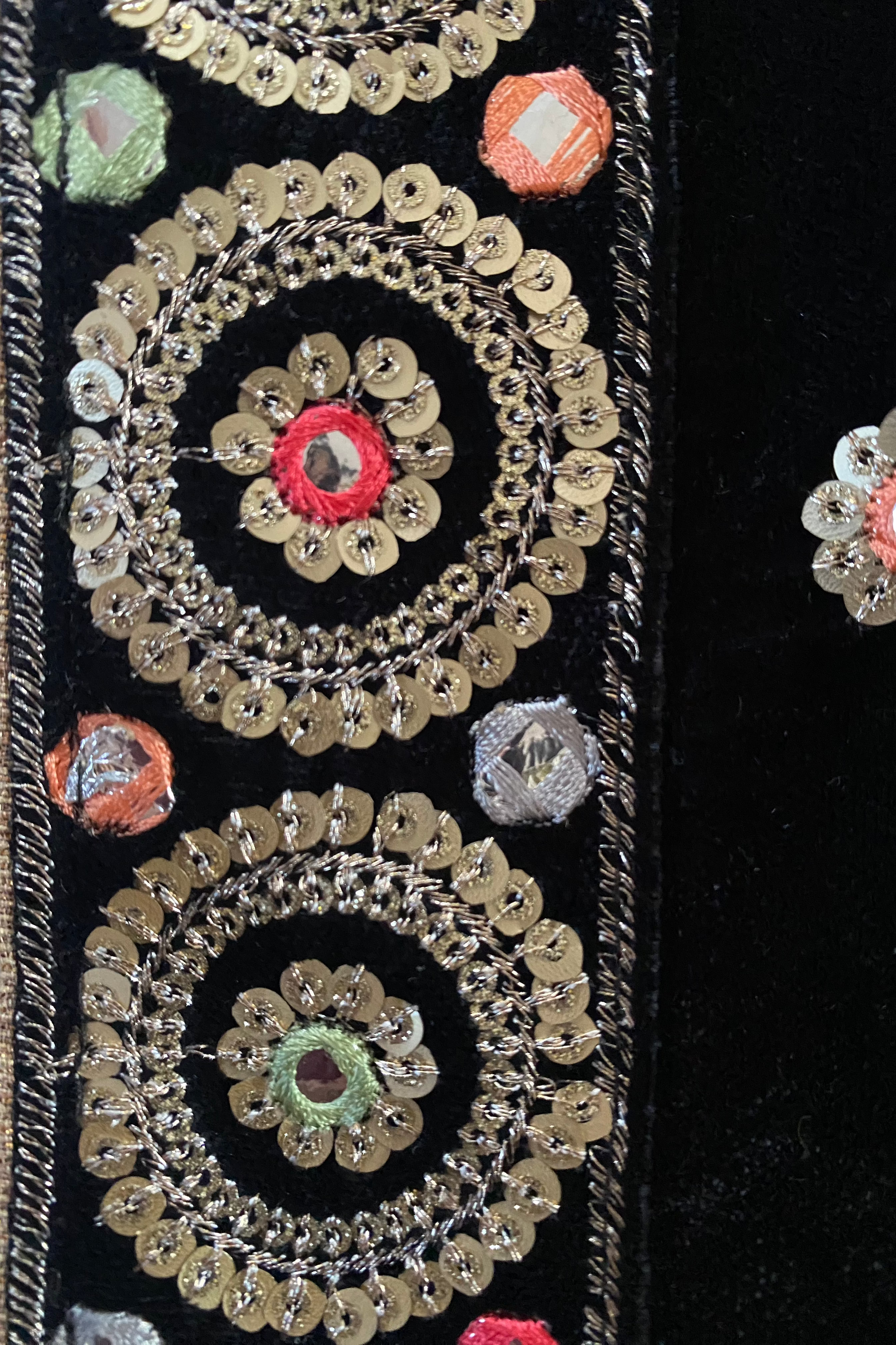 Velvet with gold embroidery and sequins. Fully lined with 2 front pockets.